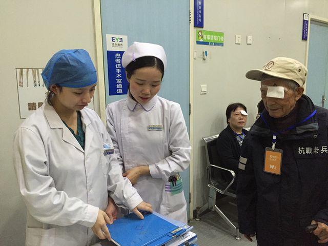? ? ? ?10月中旬,關(guān)愛抗戰(zhàn)老兵組織在湖北的志愿者聯(lián)系到武漢愛爾眼科醫(yī)院,希望可以為抗戰(zhàn)老兵李頌卓進(jìn)行眼部檢查并確定是否可以手術(shù)。醫(yī)院了解到李頌卓老人的情況后,派專車將老人接至醫(yī)院,并全程安排工作人員為其開辟綠色通道進(jìn)行檢查。經(jīng)檢查,李頌卓右眼視力0.4,左眼視力為0.2,白內(nèi)障已經(jīng)影響到老人的正常生活,因此需要馬上實施白內(nèi)障手術(shù)。