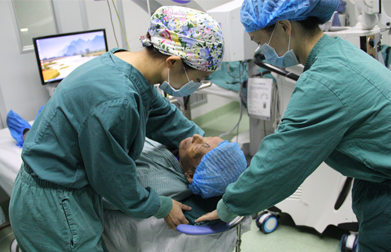 ? ? ? ?10月29日上午10點,李頌卓老人被推進(jìn)了手術(shù)室,換手術(shù)服、消毒、上手術(shù)床、眼部麻醉、實施手術(shù)、手術(shù)完成、再將老人從手術(shù)床扶起、送出手術(shù)室,整個過程僅十幾分鐘。“手術(shù)非常成功,您可以放心照顧老伴啦!”為李頌卓老人實施手術(shù)的白內(nèi)障科主任王勇博士笑著說。
