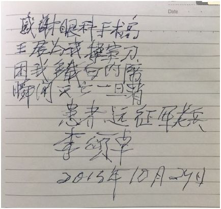 ? ? ? ?2年前,這位抗戰(zhàn)老英雄就已經(jīng)發(fā)現(xiàn)自己看東西模糊不清,并確診為白內(nèi)障,但因老伴身體欠佳,擔(dān)心自己手術(shù)后無人照顧老伴,所以一直未接受治療。